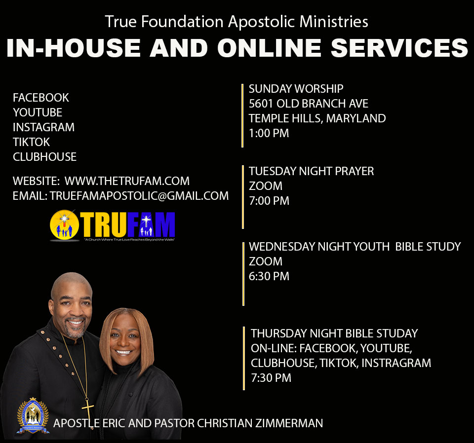 We’re glad you have chosen to worship online with us. True Foundation Apostolic Ministries better known as TRUFAM, is a progressive apostolic church located in the D.C. Metropolitan area, that is committed to making a difference in the community and the lives of all who are called by God to advance His kingdom here on earth. Our mission is to encourage, empower & equip followers of Jesus Christ through the gospel of Jesus Christ and through the love of God that reaches beyond the walls of the church. We meet every Sunday, 12 Noon at 7165 Old Alexandria Ferry Rd | Clinton, Maryland 20735. We would love to see and meet you. Thank you for visiting our site. We hope you enjoy and again, Welcome!